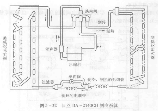 熱泵型窗式空調器的制冷系統如圖5-32所示。圖5-32中實線方向是制冷時制冷劑的流向,虛線方向是制熱時制冷劑的流向,依靠換向閥轉換。單向閥的作用是使制冷劑在制冷時不經過制熱毛細管。由于制冷劑流向可以通過四通電磁換向閥轉換,因此;熱泵型空調器既可以像單冷型那樣制冷,也可以制熱。