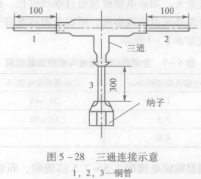 ①選擇一只與毛細管外徑相近的三通管;分別選擇兩根與毛細管外徑相近、長為100mm和另外一根長為300mm、直徑為6mm共計3根銅管,并在直徑為6mm的銅管套裝納子。