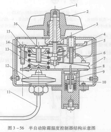 除霜時,將除霜按鈕壓下,則動、靜觸點分開,切斷壓縮機電路,壓縮機停轉(zhuǎn),制冷停止。這時除霜控制板除受主彈簧的作用力外,還受除霜彈簧的作用。當(dāng)箱溫升到一定溫度值(除霜終了溫度),感溫腔體積膨脹伸長至足以推動杠桿時,動、靜觸點閉合,壓縮機運轉(zhuǎn),又開始制冷,同時除霜按鈕自動彈起復(fù)位,使半自動除霜溫度控制器進入正常的溫控工作狀態(tài)。