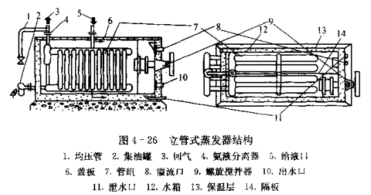 立管式蒸發器安裝在一個長方形的水箱內,結構如圖4-26所示。它由上集氣管和下集氣管及介于其間的許多立管組成。上集氣管的一端焊有一個氨液分離器,下面有一根立管直接與下集掖管相通,下集液管的一端焊有集油罐,集油罐上端的均壓管與回氣管相通。