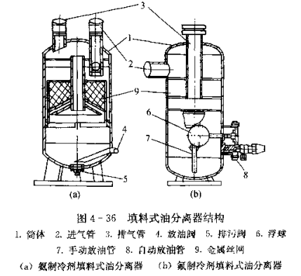 填料式油分離器 填料式油分離器的結(jié)構(gòu)如圖4-36所示,圖4-36a為氨制冷劑的填料式油分離器,圖4-36b為氟制冷劑的填料式油分離器,它主要由筒體、填料進(jìn)氣管、排氣管、放油閥和排污閥等組成。填料一般使用多層金屬絲網(wǎng),填料的上下用多孔鋼板固定,安裝在筒體的中間位置。濟(jì)南壓縮機(jī)排氣從上部進(jìn)氣管進(jìn)入筒體,經(jīng)填料層進(jìn)行分離后,油滴流入筒底,氣體從出氣管導(dǎo)出,去冷凝器。筒體下部的放油閥距筒底留有一定的高度,用來(lái)排除油中的水分和污物。
