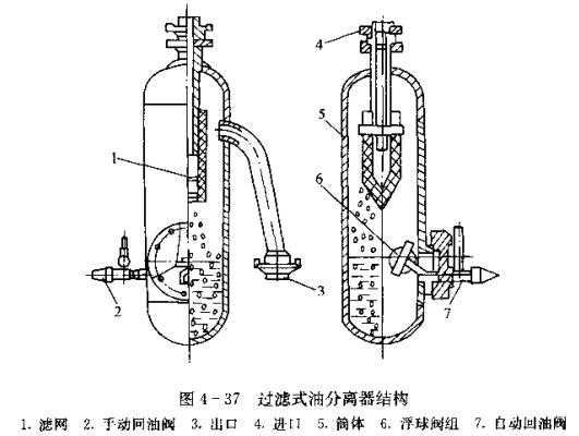 過(guò)濾式油分離器 過(guò)濾式油分離器主要用于氟制冷系統(tǒng),其結(jié)構(gòu)如圖4-37所示。它由筒體、進(jìn)氣管、出氣管、濾網(wǎng)、手動(dòng)回油閥和自動(dòng)回油閥等組成。一般銅絲過(guò)濾網(wǎng)含有油的蒸汽從上部進(jìn)氣管進(jìn)入,經(jīng)過(guò)濾網(wǎng)過(guò)濾后,油被粘附在過(guò)濾網(wǎng)上聚集成油滴落入筒底,而高壓氣體從出氣管去冷凝器,自動(dòng)回油閥安裝在筒體的下端,與壓縮機(jī)的曲軸箱相連,當(dāng)筒內(nèi)的油位代號(hào)一高到一定的位置時(shí),浮球浮起,將油閥打開,筒內(nèi)的潤(rùn)滑油便在壓差作用下被送到曲軸箱內(nèi)。當(dāng)油位降低時(shí),浮球下降,又可將回油閥關(guān)閉。