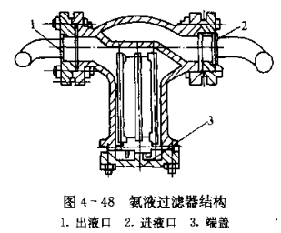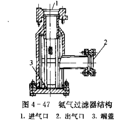 氨氣過(guò)濾器的結(jié)構(gòu)如圖4-47所示,殼體上設(shè)有進(jìn)氣口、出氣口和端蓋。器內(nèi)設(shè)置有三層鋼絲濾網(wǎng),網(wǎng)孔為0. 4 mm。氨氣過(guò)濾器安裝在濟(jì)南壓縮機(jī)吸氣管道上,其作用是濾除蒸氣中雜質(zhì),避免這些雜質(zhì)進(jìn)入壓縮機(jī)而損壞汽缸和閥片。