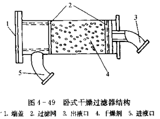 干燥過(guò)濾器有立式和臥式兩種,內(nèi)部結(jié)構(gòu)基本相同。臥式干燥過(guò)濾器如圖4-49所示。內(nèi)部裝有活性氧化鋁、無(wú)水氯化鈣或硅膠,用來(lái)吸收制冷劑中的水分。干燥過(guò)濾器的進(jìn)液口和出液口的兩端裝有過(guò)濾網(wǎng),用來(lái)除去制冷系統(tǒng)中的機(jī)械雜質(zhì),防止堵塞。