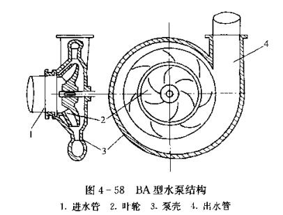 BA型水泵的結構如圖4-58所示,由蝸形外殼、排水管、葉輪等構成。葉輪平鍵與傳統軸連接,長軸伸出殼體處用軟填料密封,長軸兩端滾珠軸承支承,其尾端用連軸器與電動機連接,當電動機通電轉動帶動葉輪旋轉,由于葉輪上鑄有弧形葉片,葉片使水作回轉運動,產生離心力,使水不斷地排出。