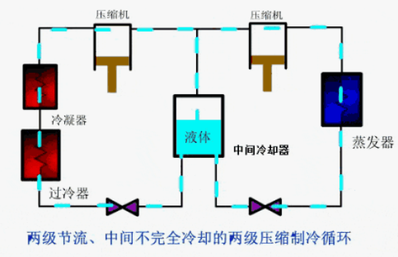 不完全中間冷卻的雙級壓縮制冷循環系統的工作原理與完全冷卻的雙級壓縮機制冷循環系統相同的是,也在高壓壓編機和低壓壓編機之間設置了中間冷卻塔,但低壓壓縮機的排氣不進入中間冷卻塔,而是與中間冷卻塔節流膨脹后的蒸汽混合后進入高壓壓縮機。例如,一般的氛雙級壓縮制冷系統大多采用不完全中間冷卻形式,其制冷劑的膨脹節流和冷卻過程與完全中間冷卻的雙級壓縮制冷循環相同。