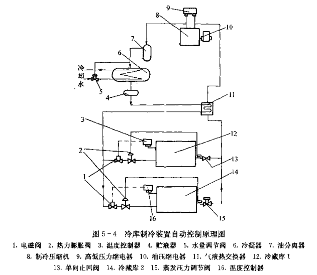 如圖5-4所示是濟(jì)南安裝的兩間冷藏庫(kù),由一臺(tái)壓縮機(jī)集中供冷。為了實(shí)現(xiàn)裝置的自動(dòng)運(yùn)行調(diào)節(jié),在系統(tǒng)中增設(shè)了油壓繼電器、高低壓壓力繼電器、水量調(diào)節(jié)閥、電磁閥、熱力節(jié)流閥,濕度控制器、單向止回閥和蒸發(fā)壓力調(diào)節(jié)閥等部件。