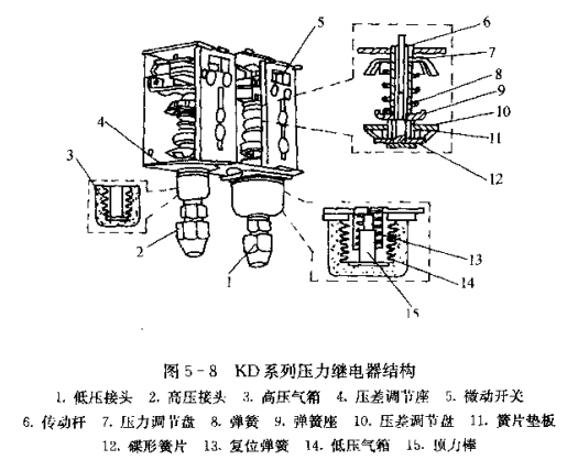 KD系列壓力繼電器也是一種高低壓力繼電器,它的高、低壓各有自己的觸點和電路,實際上是兩個壓力繼電器的組合。如圖5-8所示,使用時,用毛細管分別與制冷壓縮機的排氣腔和吸氣腔連接。其壓力信號通過頂桿作用于彈簧的張力,再通過傳動桿使微動開關的觸點分離或閉合來接通或斷開電源,從而達到控制的目的。