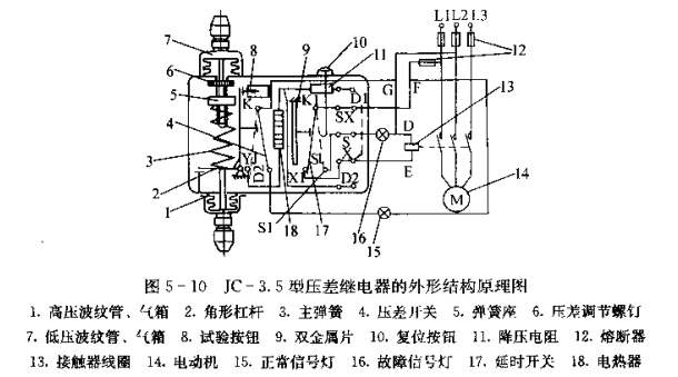 目前制冷裝置中所使用的壓差繼電器結構和工作原理基本相同,現以JS-3. 5型壓差繼電器為例介紹如下: