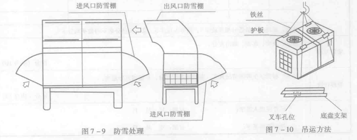 5)降雪地區(qū)要安裝防雪設(shè)施。(防雪設(shè)施不完備時(shí),易發(fā)生故障)為不受積雪影響,應(yīng)架高架臺(tái),并在進(jìn)風(fēng)口和出風(fēng)口安裝防雪欄,如圖7-9所示。