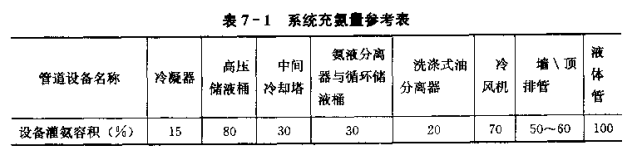 充注方法是:氨瓶上的充氨閥與儲液器上的進液閥接通,打開閥門,將氨瓶下傾30度左右,用臺秤計量,使系統抽真空,利用氨瓶與系統的壓差,將氨液充入,當二者壓差達到平衡時,可關閉出液閥,啟動制冷壓縮機,關小充氨閥,使氨液通過低壓段慢慢充入。系統充氨量如表7-1。