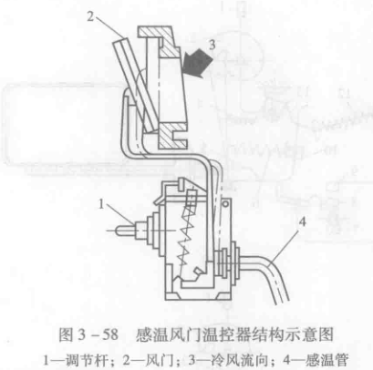 風門溫度控制器由感溫系統(感溫包、波紋管)、機械傳動裝置和風門組成。感溫系統和機械傳動裝置的功能與前述溫控器相同。風門的尺寸能完全遺蓋風道口;感溫系統的動作傳遞到風門并轉變成風門的旋轉運動,風門的旋轉角度隨波紋管內工質壓力的大小而變化,波紋管的作用力甚至可使風門外在全開或全閉狀態;通過風門旋轉角度的變化,可以改變風道口的開啟度,從而控制冷風的通過量,使箱內溫度得以調節,當冷藏室溫度下降時,感溫管溫度也下降,則波紋管的壓力下降以使風門關閉。