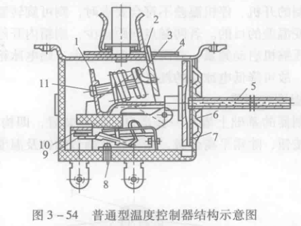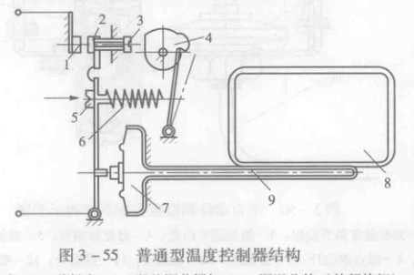 普通型濕控器工作原理如圖3-55所示。普通型溫度控制器的感溫管一般固定在靠近蒸發器的內膽上,當蒸發器表面的溫度低于預定值時,傳動膜片向右移動,使動、靜點迅速斷開,切斷壓縮機電動機的電源,使壓縮機停轉。停機一段時間后,電冰箱內及蒸發器表面溫度回升,并超過設定值,傳動膜片向左移動,頂住觸點杠桿,導致動、靜觸點閉合,電路系統接通,壓縮機運轉,制冷系統恢復工作。
