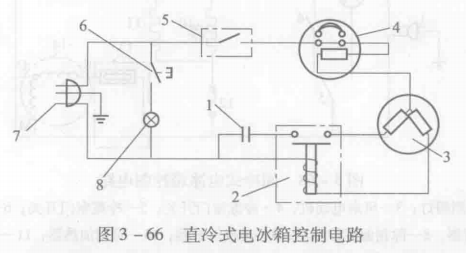 此電路的組成包括:啟動(dòng)保護(hù)及控制電路,由溫度控制器、啟動(dòng)電容器、重錘式啟動(dòng)繼電器、壓縮機(jī)電動(dòng)機(jī)和過流過熱保護(hù)繼電器組成;照明電路,由燈開關(guān)與燈構(gòu)成。當(dāng)箱內(nèi)溫度高于溫度控制器調(diào)定的溫度時(shí),溫度控制器接通,壓縮機(jī)電動(dòng)機(jī)啟動(dòng)運(yùn)轉(zhuǎn)。啟動(dòng)電容器的作用是對(duì)壓縮機(jī)電動(dòng)機(jī)啟動(dòng)繞組電流移相,增大啟動(dòng)轉(zhuǎn)矩,改善啟動(dòng)性能。當(dāng)冰箱內(nèi)溫度下降到用戶所設(shè)定的溫度時(shí),溫度控制器斷開而使電冰箱停止工作,直冷式電冰箱控制電路如圖3-66所示。