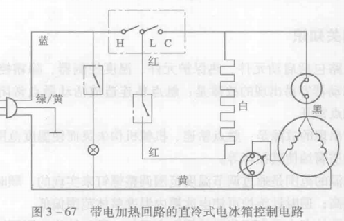 為避免由于環(huán)境溫度過低(放置電冰箱的房間無(wú)取暖設(shè)備或在我國(guó)黃河與長(zhǎng)江之間的地域)而使壓縮機(jī)長(zhǎng)時(shí)間不啟動(dòng)運(yùn)行,造成冷凍室凍結(jié)食品解凍而影響食品新鮮度的情況,可在原電路中設(shè)電加熱回路給冷藏室蒸發(fā)器加熱。該回路是利用溫度控制開關(guān)來控制其通斷的,如圖3-67所示。其工作原理是:在溫度控制器的溫控開關(guān)L與C兩觸點(diǎn)之間并聯(lián)一個(gè)箱內(nèi)加熱絲,當(dāng)壓縮機(jī)運(yùn)轉(zhuǎn)時(shí),雖然L與C接通,但由于加熱絲被觸點(diǎn)短路,故無(wú)法通電發(fā)熱,只有當(dāng)冷藏室溫度達(dá)到溫度控制器設(shè)定值,L與C斷開停機(jī),電源經(jīng)工點(diǎn)→加熱絲開關(guān)(應(yīng)在閉合狀態(tài))→箱內(nèi)加熱絲→過載保護(hù)器→壓縮機(jī)運(yùn)行繞組構(gòu)成回路時(shí),加熱絲才通電發(fā)熱。此時(shí),由于加熱絲電阻遠(yuǎn)大于運(yùn)行繞組阻值,故壓縮機(jī)不運(yùn)轉(zhuǎn)。
