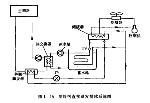 圖1-16為利用制冷劑直接蒸發(fā)制冰系統(tǒng)圖。