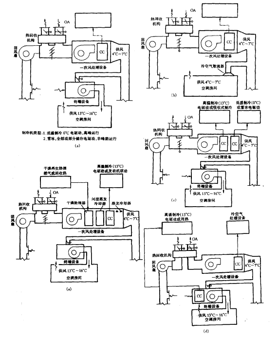 低溫送風系統限定必須使用蓄冰系統。常用的形式如圖所示的(a),(b),(c),(d),(e)所示。所有的系統帶有熱回收裝置,這也是目前對空調系統的要求。