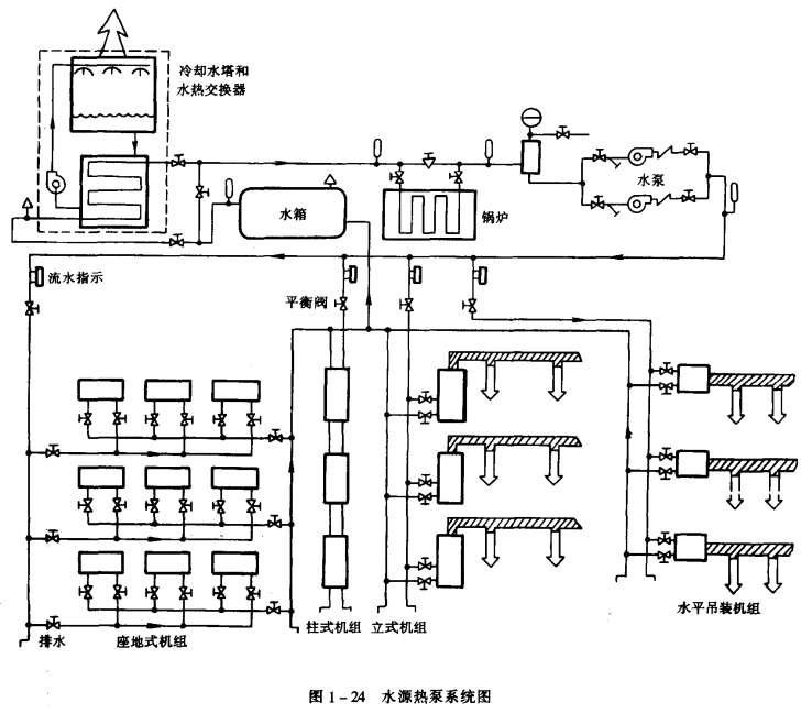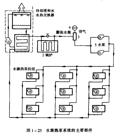 水源熱泵系統(tǒng)的主要部件見圖1-23。水源熱泵系統(tǒng)見圖1-24。
