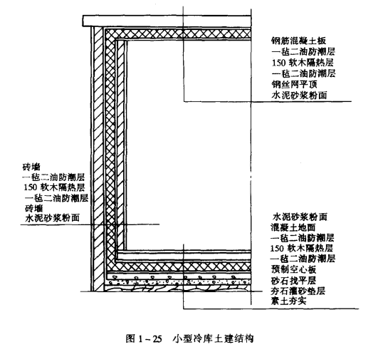 土建庫采用土建方法構筑固定的庫體,圖1-25是一種土建庫庫體圍護結構及采用的隔熱防潮措施示意圖。施工時,應使庫體四周及上下六個面的隔熱防潮材料緊密連接,分層錯縫,形成連續而密封的整體,防止有縫隙漏冷形成“冷橋”。