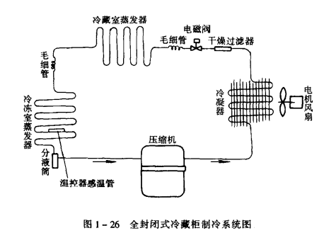 全封閉式機組冷藏柜的制冷系統由壓縮機、冷凝器、蒸發器、毛細管等組成,如圖1-26所示。壓縮機采用750W全封閉壓縮機,濟南生產的冷凝器為風冷式,采用毛細管為節流裝置,蒸發器為盤管式。
