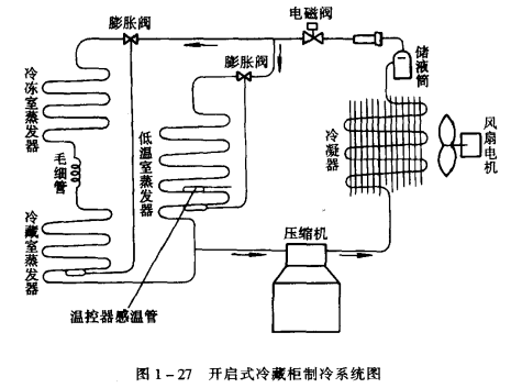 開啟式制冷壓縮機冷藏柜的制冷系統由壓縮機、冷凝器、蒸發器、膨脹閥等組成,如圖1-27所示。