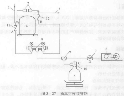 抽真空檢漏的目的是抽出系統中的殘留氫氣(充氨檢漏后的殘留氮氣);其次是檢查系統有無滲漏;第三是對系統進行干燥處理。在充注制冷劑之前必須進行抽真空操作。抽真空時的管路連接如圖5-27所示,該操作采用了復合式壓力計。復合式壓力計有三個連接口,左邊為低壓連接口,右邊為高壓連接口,中間接口可作為抽真空用,也可以作為制冷抽真空狀態機的充入管接口。