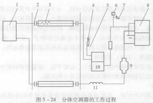 分體式空調器的工作過程如圖5-24所示。室內外機通過制冷系統的純鈾管用快速接頭連接。壓縮機運轉,使制冷劑在封閉循環的管道中流動,空調器處于制冷運轉狀態。室內空氣在風機的作用下通過空氣過濾網被吸入,經蒸發管道進行熱交換,使空氣冷卻降溫和去濕后進入風機中,再經葉輪旋轉排人風道經百葉窗流向室內,以達到對附近空氣進行調節的目的。