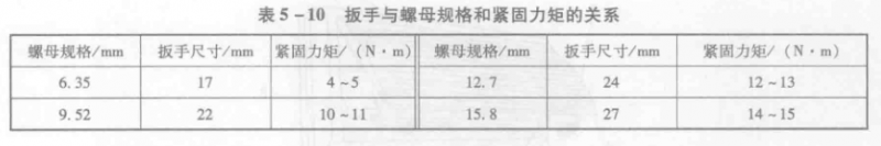 當室外機組安裝固定后,就可將從室內機組引出的液管(管徑較細的銅管)和氣管(管徑較大的銅管)與室外機組相連接。具體步又是:用扳手擰下室外機組高、低壓截止間上的封頭蓋帽,將液管和氣管另一端的螺母分別擰到高、低壓截止閱上,先用手擰4圈左右,感覺輕松順利時,再用扳手將螺母徹底擰緊,扳手的擰緊力矩與螺母和扳手的尺寸見表5-10。連接時應從氣管開始進行操作。
