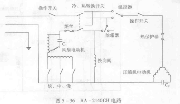圖5-36所示為RA-2140CH熱泵型窗式空調器電氣控制原理。圖5-36中冷熱轉換開關用于制冷或制熱功能轉換,風速選擇開關選擇風扇運轉速度,有快、中、慢三擋。制冷時,電磁換向閥不得電,壓縮機和風扇電動機工作;制熱時,電磁換向閥得電,制冷劑的流向被改變,同時壓縮機和風扇電動機也工作,實現制熱,空調房間溫度由溫度控制器控制。
