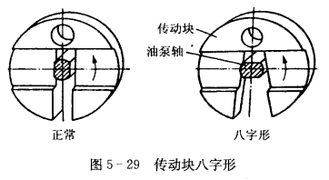 ⑤油泵傳動塊八字形。油泵軸與壓縮機曲軸后軸頸端面的傳動連接,有一傳動塊,它有一開口槽(圖5-29),油泵軸端的方榫插入槽內,以帶動油泵轉動。當排油壓力過高或經常受到沖擊,開口槽變形成八字式,使方樺打滑,油泵不會轉動,需拆開換一新傳動塊。