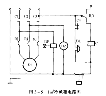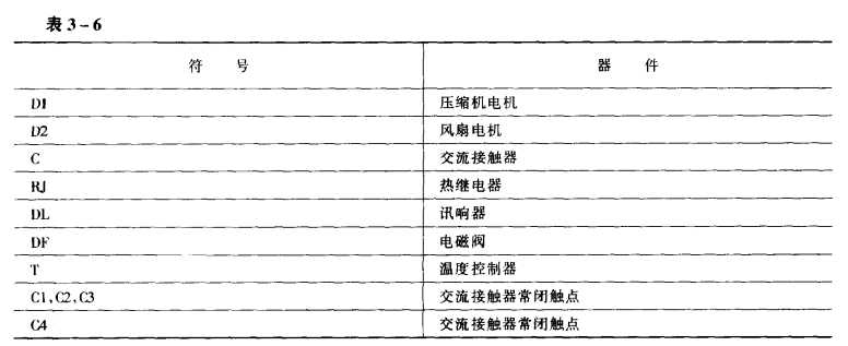 1m3容積的冷藏箱采用全封閉式壓縮機(jī),箱內(nèi)兩個(gè)溫度,設(shè)有三門(mén),左邊單門(mén)是冷凍室(-50℃),右邊雙門(mén)為冷藏室(+5℃)。電氣控制系統(tǒng)由壓縮機(jī)的啟動(dòng)繼電器、啟動(dòng)電容、過(guò)負(fù)荷保護(hù)器、報(bào)警繼電器、訊響器、溫度控制器等組成,如圖3一5和表3一6所示。