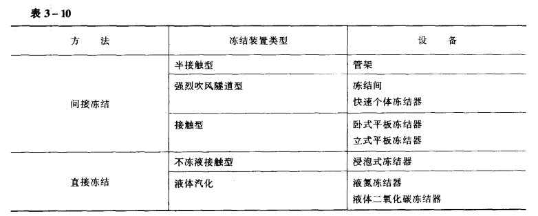 食品的凍結(jié)按食品的凍結(jié)程度可分為微凍(-4℃)、凍結(jié)(-12℃~-10℃)和深凍(-18℃以下)。按凍結(jié)方法可分為間接凍結(jié)和直接凍結(jié)。按凍結(jié)速度可分為慢速凍結(jié)、中速凍結(jié)和快速凍結(jié),詳見(jiàn)表3一10和表3一11。