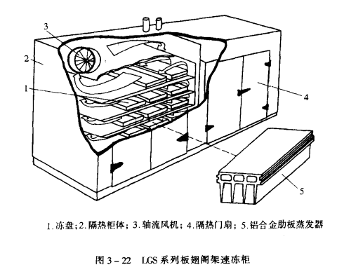 隨著我國小包裝食品對凍結技術的需要,閣架式凍結設備已更新換代。圖3-22為LGS系列板翅閣架速凍柜的結構,此類產品凍結魚塊時厚度70mm凍結不超過5小時。