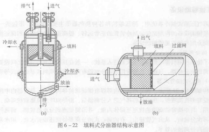 圖6-22所示為填料式油分離器的結構:在分離器中有一層填料,填料可用不銹鋼絲、陶瓷環或金屬切導等,其分離效果以不銹鋼絲為最佳。制冷劑蒸氣通過油分離器的填料層后,把潤滑油分離出來,分離器內的車氣流速應在0.5m/s以下。填料式油分離器也可以臥式安裝。填料式油分離器的效率較高,但是蒸氣流通阻力也較大。