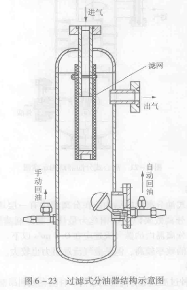 如圖6-23所示為一種過濾式油分離器的結構。目前在氟利昂制冷系統中,常使用這種油分離器。工作時高壓蒸氣由進氣管上部進入,經濾網減速、過濾后,從側部出氣管排出,蒸氣中攜帶的部分潤滑油被分離出來,落入筒體的下部。這種油分離器的回油管和壓縮機的曲軸箱連接。當器內積聚的潤滑油足夠使浮球閥開啟時,潤滑油就被壓入壓縮機的曲軸箱中。當油面逐漸下降到使浮球下落到一定位置時,則浮球閥關閉。正常運行時,由于浮球閥的斷續工作,使得回油管時冷時熱,回油時管子熱,停止回油時管子就冷。如果回油管一直冷或一直熱,則說明浮球閥已經失靈,必須進行檢修。檢修時可使用手動回油閥進行回油操作。
