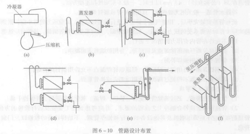 8)當蒸發(fā)器布置在壓縮機上方時,蒸發(fā)器出口處立管應設VU形彎頭,如圖6-10(b)和圖6-10(c)所示。當多臺蒸發(fā)器并聯(lián)而總回氣管又在蒸發(fā)器之上時,蒸發(fā)器回氣管應采用如圖6-10(d)所示結構。對設有調(diào)節(jié)裝置的氟利昂壓縮機回氣管,為確保壓縮機輸氣量發(fā)生變化時,既不影響豎管中垂直向上的氣流速度,又不會使管道中壓降過大,可采用雙吸氣豎管的結構,如圖6-10(e)所示。