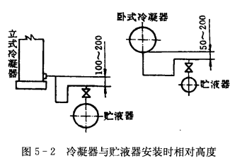 (3)貯液器。貯液器的安裝與臥式冷凝器相同,根據(jù)使用的具體情況,貯液器可以不用地腳螺絲而直接放在支座上。冷凝器和貯液器安裝時(shí)的相對高度,如圖5-2所示。其相對高度應(yīng)予保證,使冷凝后的制冷劑液體靠重力流入貯液器的可能性。