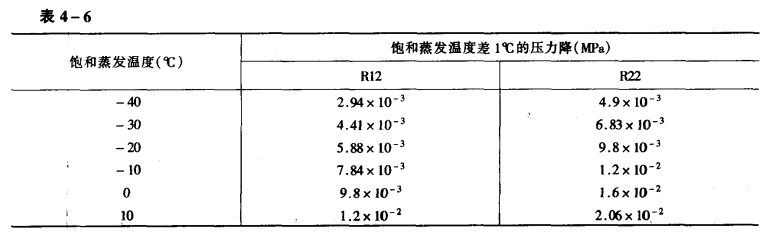 1、吸氣管中的壓力降直接影響到制冷系統的產冷量,為此應把壓力降控制在允許范圍內。一般,氟利昂制冷系統回氣管的壓力降應不超過飽和蒸發溫度差1℃所對應的壓力降,見表4一6。