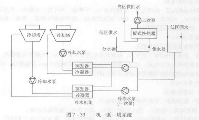 3) 冷水機組、水泵、冷卻塔一一對應(yīng)分別連接組成的系統(tǒng),簡稱一機一泵一塔系統(tǒng),如圖7-33所示。