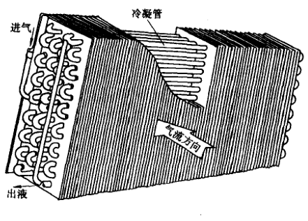 這類冷凝器是以空氣為冷卻介質(zhì)的冷凝器,制冷劑在冷凝管中流動,空氣在管外掠過,低于制冷劑溫度打空氣吸收制冷劑熱量后,就散發(fā)在周圍環(huán)境中,由于空氣的導(dǎo)熱系數(shù)很小,所以空氣側(cè)的方熱系數(shù)很低,影響了冷凝器的傳熱系數(shù),為了提高空氣側(cè)的傳熱性能,通常在管外加翅片,增加空氣側(cè)的傳熱面積,并在風(fēng)機的鼓風(fēng)下,提高了空氣側(cè)的傳熱能力。