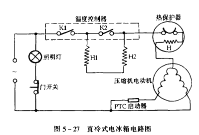 圖5一27所示為一典型的直冷式電冰箱電路圖。該電路由溫控器、熱保護器、壓縮機、啟動器、箱內照明燈、門開關等組成。其中的H為電加熱器,H1,H2為附加加熱器。