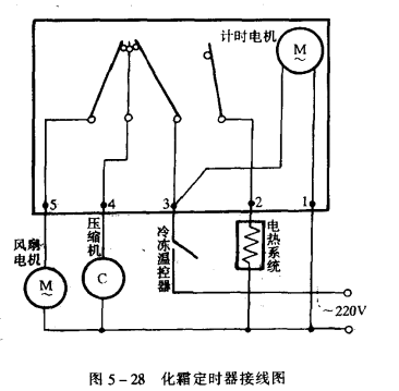 化霜定時器接線見圖5一28,,化霜定時器接頭使定時器計時電機與電源相接,接頭2與化霜電加熱系統相接,接頭3與冷凍溫控器相接,接頭4與壓縮機電機相接,接頭5與風扇電機相接。