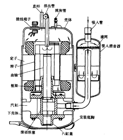 空調器用旋轉式壓縮機一般為立式,如圖2-5所示。壓縮機在泵殼的下部,電動機在上部,整個汽紅的外部幾乎是浸在冷凍油中,轉子(活塞)裝在汽缸里面,并套在偏心軸的偏心拐上,偏心以O為軸心帶著活塞在汽缸內沿著汽缸壁面滾動。汽缸壁有一條穿通的槽,槽內裝著滑塊,它們配合精度很高,滑塊與轉子配合下,在槽內滑動,它在彈簧力的作用下與滾動轉子外圓壁面緊密接觸,而組成動密封,將滾動轉子和汽紅壁之間的月牙形空間分成進氣腔Vs與壓縮腔Vs兩部分。在偏心軸繞汽缸中心旋轉一周的過程中,進氣腔完成進氣過程。與此同時,壓縮腔完成壓縮和排氣過程,當滾動轉子將滑塊完全推入汽缸槽內時,整個汽缸便成完整的月牙形,這時它所具有的汽缸容積便是壓縮機的有效工作容積Vh。滑塊與圓柱轉子高度相等,汽缸高度比轉子稍高出一點點,汽缸口上蓋有汽征蓋,活塞端面與汽缸蓋平面之間有一定間距,以使活塞與滑塊能在汽缸內自動運動。端面間隙靠冷凍油密封,在汽缸槽兩旁的汽缸體上有吸、排氣孔,吸氣孔口沒有吸氣閥,蒸氣直接由有吸氣管進入汽缸的吸氣孔,排氣口上裝有排氣閥。汽缸內的氣體排出而進入和泵殼內,所以旋轉式壓縮機對殼內是高壓氣體,屬高壓區,而往復式壓縮機的泵殼內是低壓氣體,屬低壓區。旋轉式壓縮機中,電動機被高溫氣體包圍,電動機繞組的溫度相當高,對電動機的冷卻是不利因素。為此要提高電動機繞組的絕緣等級,以提高繞組的耐溫性能,確保電動機繞組的安全。由于旋轉式壓縮機的吸氣是直接由吸氣管提供,為確保安全,防止液擊,其吸氣管上裝有氣液分離器,把多余的液體分離后儲存在氣液分離器內,逐步吸熱汽化后,再進入壓縮機。