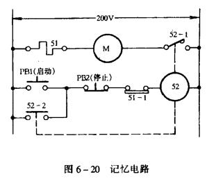 在操作電路中,使用手動操作自動復位的按鈕開關PB1(啟動開關),PB2(停止開關)和電磁接觸器52的A接點52一1組成記憶電路,如圖6一20所示。不使電動機M周而復始的反復運轉、停止,就可以避免電動機M被燒毀。運轉時,用手按下按鈕開關PB1,電源電壓通過按鈕開關PB2、過載繼電器51的B接點51一1,電磁接觸器52的電磁線圈52被激磁,電磁接觸器52的A接點52一1,52一2閉合,其中一個使電動機M運轉,另一個供給電磁線圈52電源電壓。把手從按鈕開關PB1上拿開,接點PB1自動復位、斷開。這時電磁接觸器52的A接點52-2仍閉合,由此電路供給電磁線圈52電源電壓,運轉繼續進行。