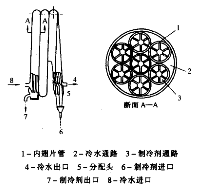 套管式蒸發器的特點是流體流速高,其放熱系數也高,結構緊湊,稱為一種高效率的蒸發器,但這種蒸發器存在水側容易冰凍和清洗困難的缺點,它用于小容量的冷水機組中有發展前途。