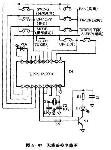 本電路由晶體振蕩器、D1(UPDS 121000芯片)、功能鍵矩陣電路及紅外發射電路組成。 晶振電路的作用是產生時鐘脈沖,電容Cl,C2起微調作用。時鐘脈沖經D1芯片內部電路分頻以后送往定時門(定時門也在D1芯片內部),由D1芯片?、?、?、?腳輸出4種相位不同的掃描脈沖,對矩陣鍵盤進行掃描,各功能鍵起編碼作用,各功能鍵與D1芯片第①、②、③、④腳組成鍵盤輸入電路,當某一功能鍵按下時,D1芯片內的微控制器經過分析判斷,D1芯片的第⑤腳將輸出控制脈沖,D1輸出的指令碼加到紅外激勵管V1的基極,放大后從集電極輸出加到紅外發射管E1,在調制信號的激勵下,E1被導通,產生紅外線向空間輻射,VD2為開機指示發光二極管。E1發出的紅外線信號則由室內機組紅外接收器接收。并轉換成數字信號,輸入主機微電腦芯片,去控制相關電路的工作狀態。