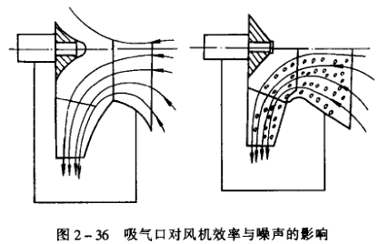 從上面分析可知,空氣動力噪聲與通風機的流動損失有關。通風機的損失越大,即效率越低,空氣動力噪聲越大,如圖2-36所示。圖中左面的通風機采用圓錐形吸入口和圓錐形的葉輪前盤,氣流吸入口,前盤和軸盤處都會產生渦流,故氣流的損失較大,風機的效率較低,噪聲也較大。圖中右面的通風機采用圓弧形吸入口和圓弧形的葉輪前盤,且軸盤做成流線形,氣流很平順、損失小、效率高、噪聲也小。葉片形式對噪聲的影響也很明顯。后向葉片的噪聲就比前向葉片要小,若采用強后向圓弧薄板型或強后向機可型葉片,則葉道產生的空氣動力噪聲可以減小到最小,一般講的高效低噪聲的通風機,都是采用上述方式來提高效率、降低噪聲的。關于減小機械噪聲的方法,一般通過采用滑動軸承、葉輪進行平衡試驗等方法,以減小不平衡震動。