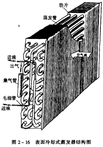 小型空調器的蒸發器絕大部分是直接冷卻空氣的,稱為表面冷卻式蒸發器,它是用風機鼓動空氣強迫對流式的蒸發器。圖2-16為表面冷卻式蒸發器的結構,管內是流動的制冷劑,其流程(往復流動路數)可分幾路,圖2-16的分路是二進二出。管外是強迫流動的空氣,管排數按需要而定,一般為2~3排。從傳熱原理知道,盡管使用了空氣強迫對流流動,但其空氣側的放熱系數還遠低于管內制冷劑的放熱系數,為提高空氣側的放熱系數,可在菠發器管外加翅片,用增加空氣側的傳熱面積的方式,來增加空氣側的傳感強度。起片管的型式很多,有代表性的有以下三種。
