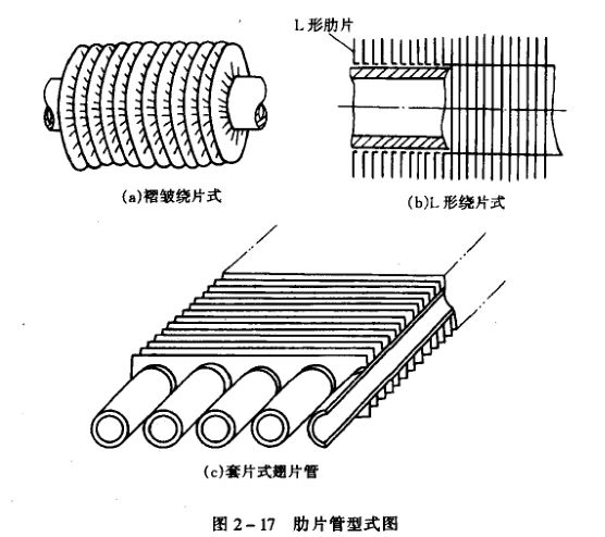 2、工形繞片式:用繞片機將紫銅片直接繞在銅管上,稱L形繞片,如圖2-17(b)所示。由于根部銅皮不打褶,銅皮受拉伸力很大,因此,不能繞較高的翅片。由于肋片根部無皺皺,故空氣的流動阻力較小,L形肋片管加工較麻煩,在冷凍設備上應用較少。