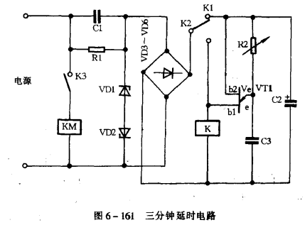 三分鐘延時電路的種類繁多,控制方式也各不相同。如圖6一161所示為一種簡單的延時電路。
